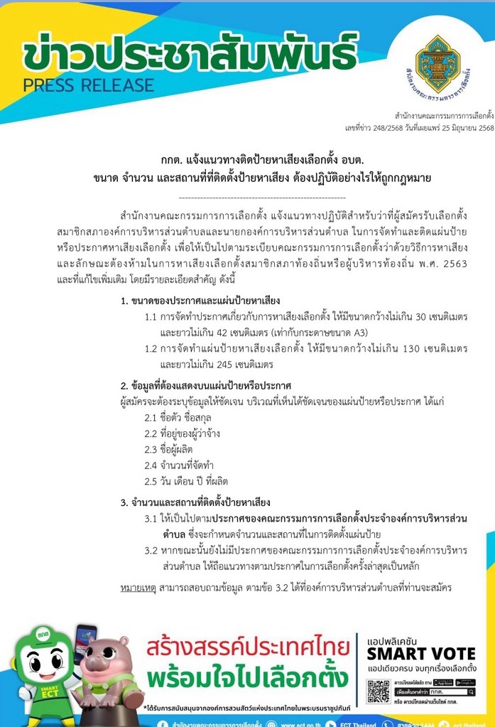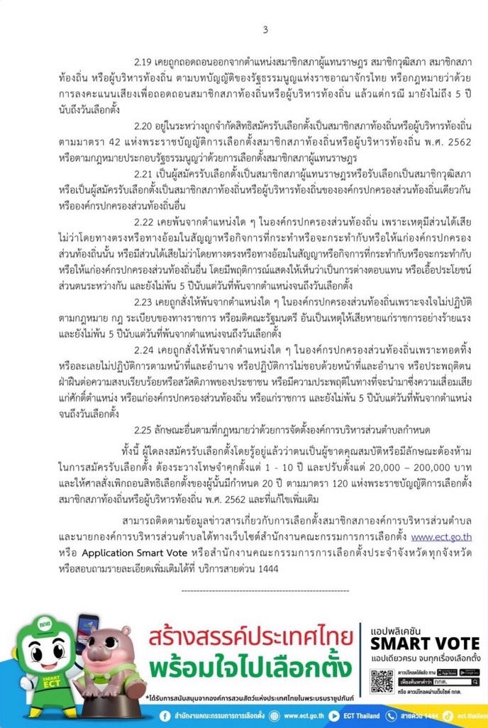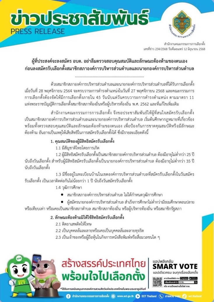 ข่าวประชาสัมพันธ์ ผู้ที่ประสงค์จะลงสมัคร อบต. อย่าลืมตรวจสอบคุณสมบัติและลักษณะต้องห้ามของตนเองก่อนลงสมัครรับเลือกตั้งสมาชิกสภาองค์การบริหารส่วนตำบลและนายกองค์การบริหารส่วนตำบล