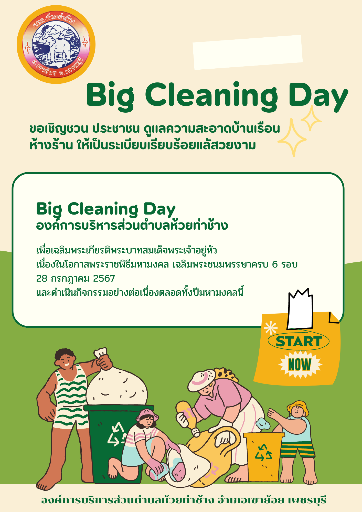 องค์การบริหารส่วนตำบลห้วยท่าช้าง ประชาสัมพันธ์การจัดกิจกรรม Big Cleaning Day เพื่อเฉลิมพระเกียรติพระบาทสมเด็จพระเจ้าอยู่หัว เนื่องในโอกาสพระราชพิธรมหามงคลเฉลิมพระชนมพรรษา ๖ รอบ